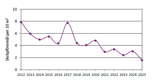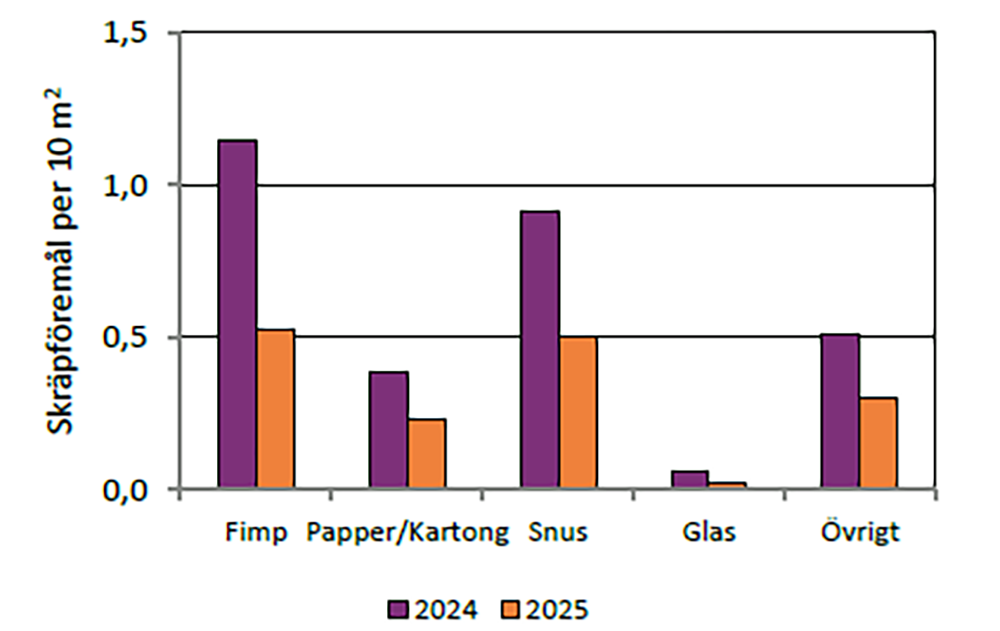 Genomsnittligt antal skräpföremål per 10 m² fördelat efter kategori 2025