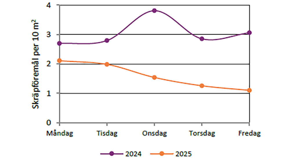 Genomsnittligt antal skräpföremål per 10 m² fördelat efter veckodag