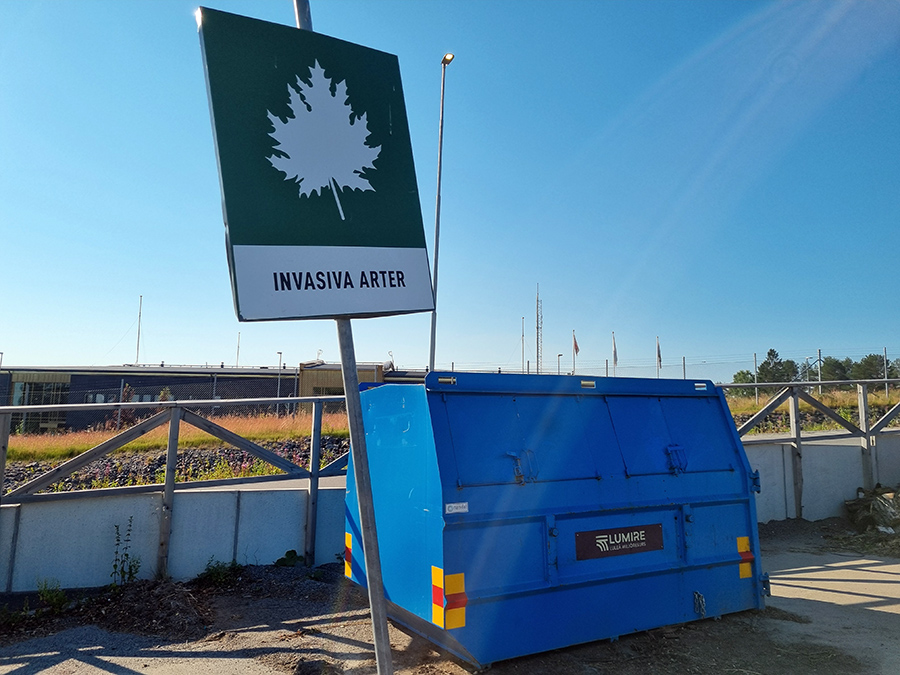 På återvinningscentralerna står containrar för säckar med samlade invasiva växter