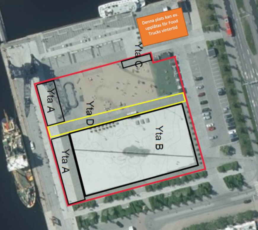 Denna yta lämpar sig för försäljning av matstånd/mattält. Vid speciella tillfällen som större evenemang under en kortare tid. 1-4 dagar kan alkoholservering tillåtas inom yta A.