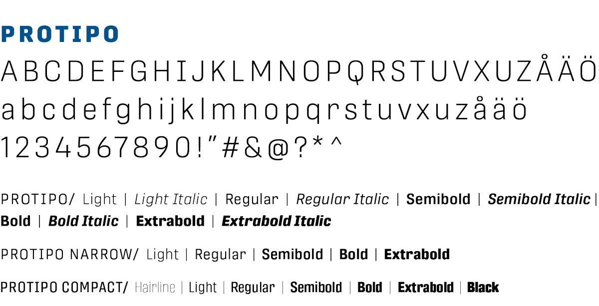 Protipo är en mångsidig och bred typsnittsfamilj med många olika skärningar och stilar som tillsammans skapar både enhetlig, modern, tydlig och variationsrik typgrafi. Väl anpassad för såväl digital kommunikation som print. Protipo finns tillgängligt via Adobe Creative Cloud för de som producerar kommunikation inom Luleå kommun.