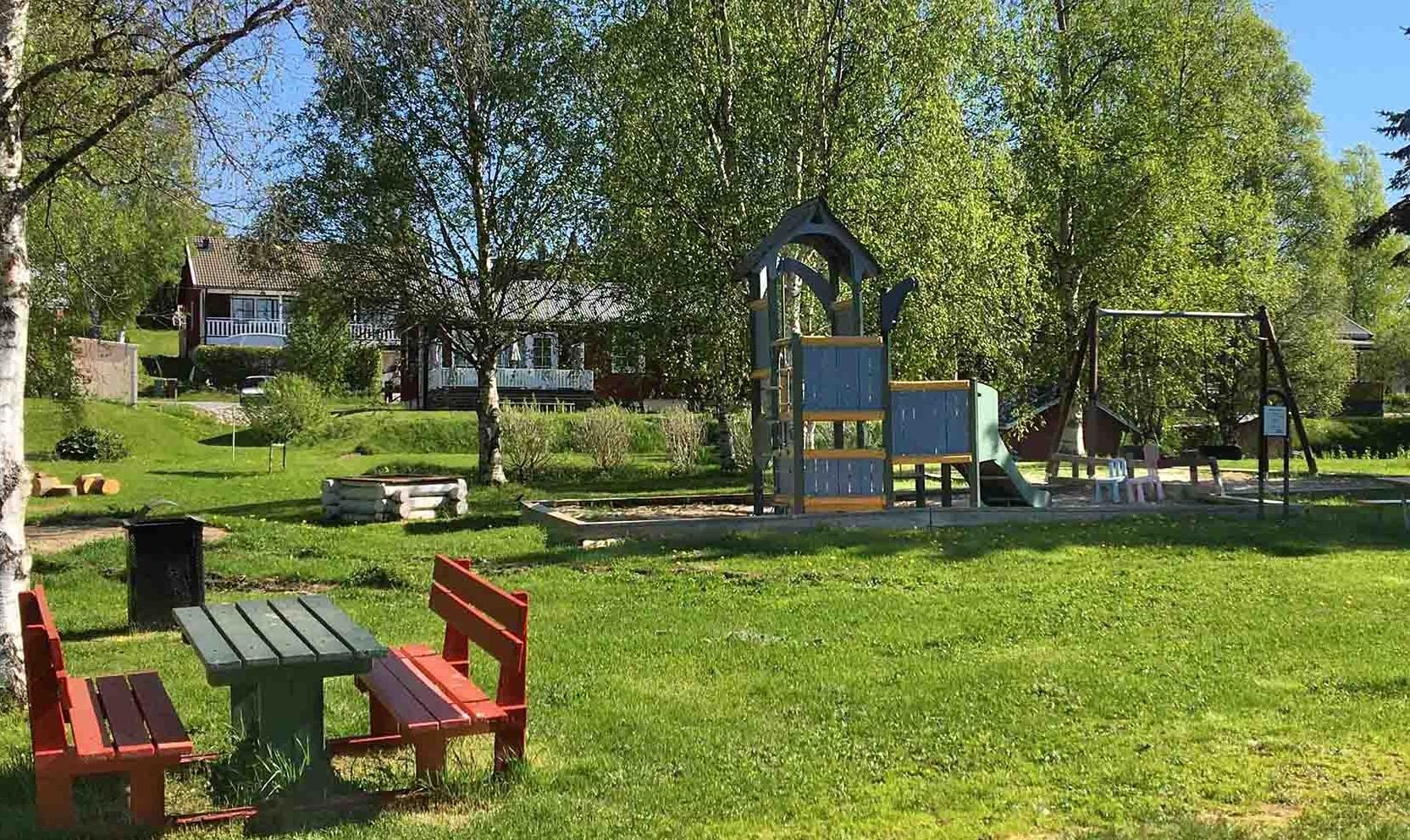 Lekplats med lek- och klättertorn med rutschkana och gungor. Intill finns sittplatser med bord och en mindre grillplats.