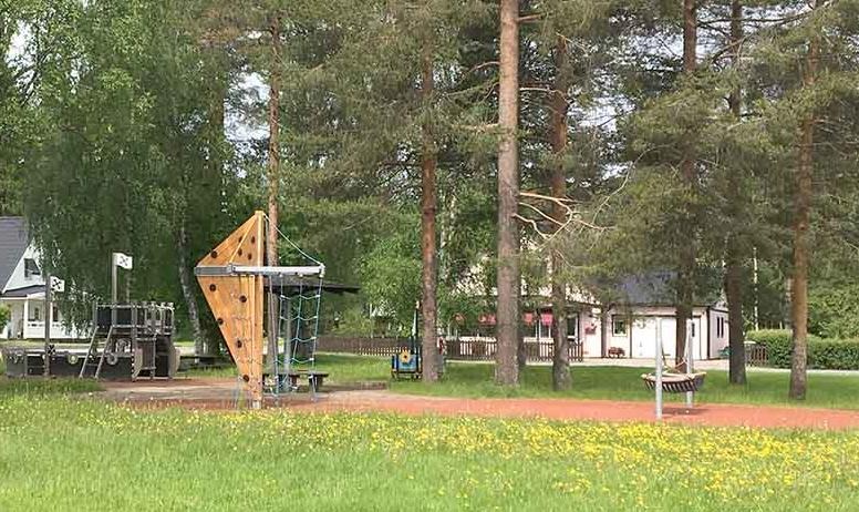 En lekplats med ett piratskepp att klättra i. Klättervägg och nät men även en hängmatta.