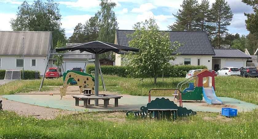 Den enkla lekplatsen ligger nära bostadsområdet och har gungor i sandyta med gräsytor bredvid. Klättertorn och sittbänkar i form av djur, till exempel giraff och krokodil.