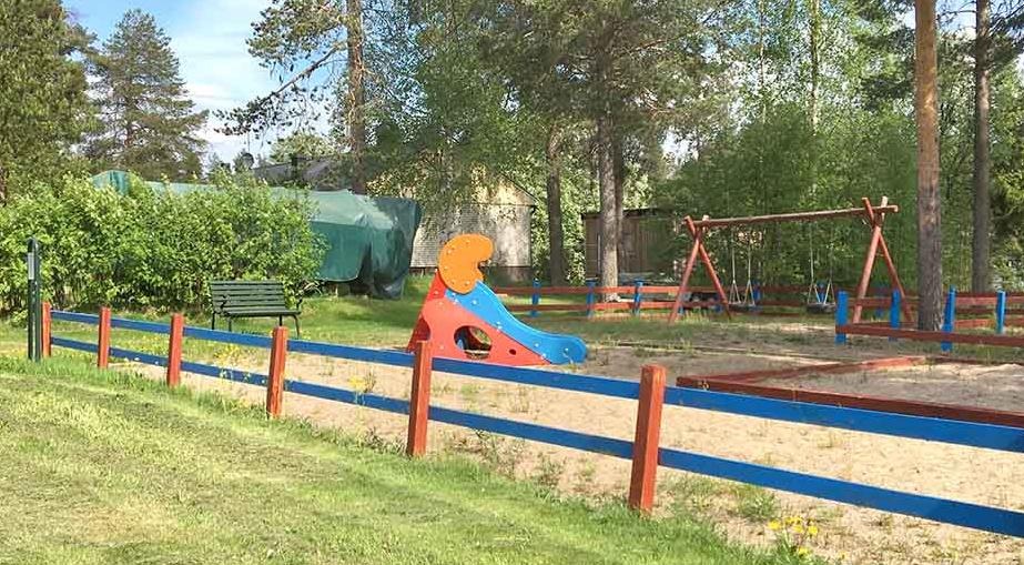 Lekplatsen har ett staket runt i blått och rött. Här finns en rutschkana, en gungställning och sandlåda.