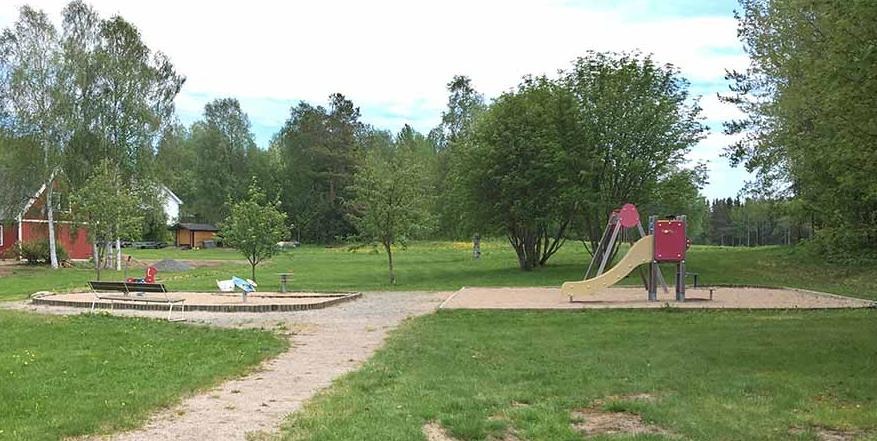 Lekplatsen har en rutschkana, gungor och gungleksaker. Bänkar finns vid kanten.