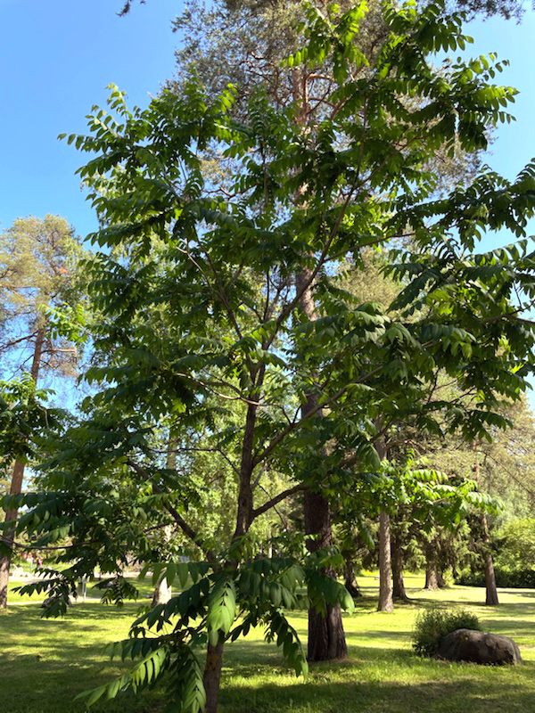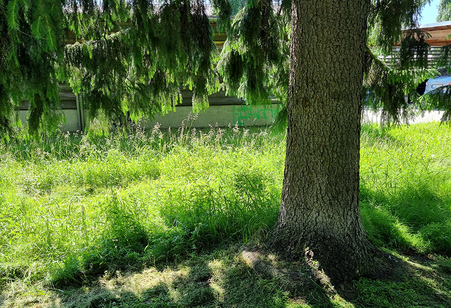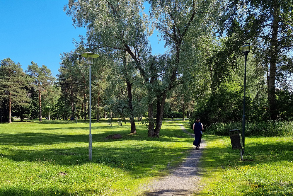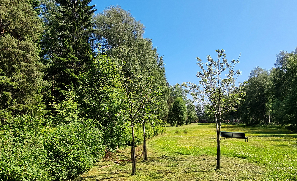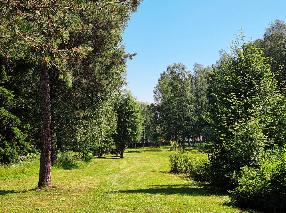Gångvägar mellan klippta gräsytor och öppen skog.